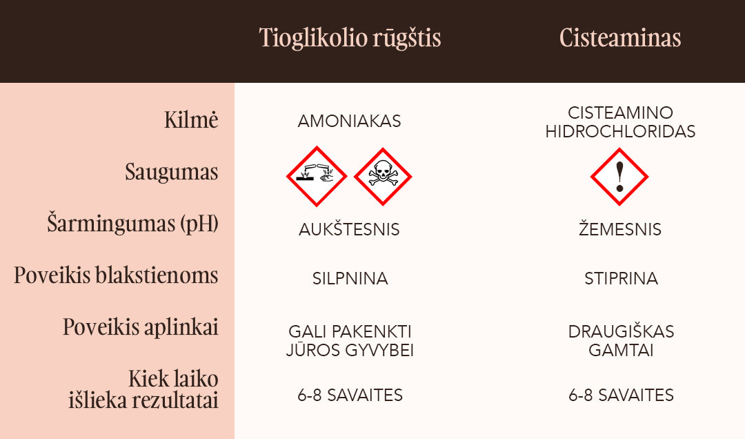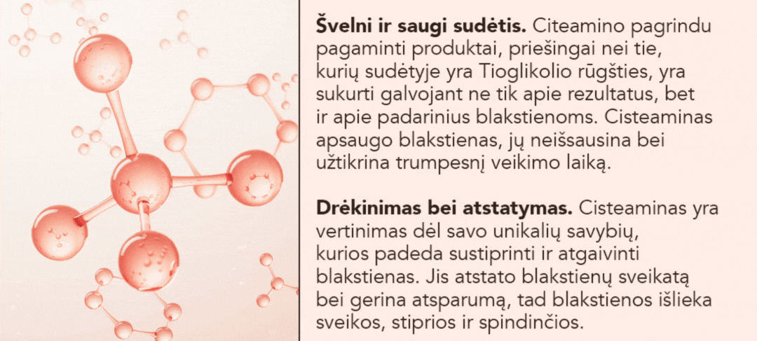 Sudėtis: Aqua (Water), Cysteamine Hcl, Stearyl Alcohol, Sodium Hydroxide, Par- Affinum Liquidum (Mineral Oil), Ceteareth-25, Propylene Glycol, Cetyl Alcohol, Glycerin, Dimethicone, Disodium Edta, Guar Hydroxypropyltri- Monium Chloride, Parfum (Fragrance), Petrolatum, Polyquaternium-6, Al- Pha-isomethyl Ionone, Citronellol, Geraniol.