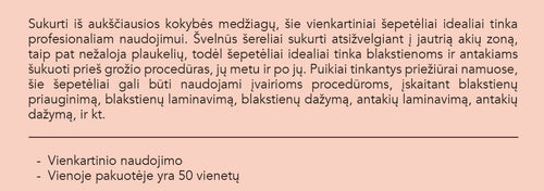 Sukurti iš aukščiausios kokybės medžiagų, šie vienkartiniai šepetėliai idealiai tinka profesionaliam naudojimui. Švelnūs šereliai sukurti atsižvelgiant į jautrią akių zoną, taip pat nežaloja plaukelių, todėl šepetėliai idealiai tinka blakstienoms ir antakiams šukuoti prieš grožio procedūras, jų metu ir po jų. Puikiai tinkantys priežiūrai namuose, šie šepetėliai gali būti naudojami įvairioms procedūroms, įskaitant blakstienų priauginimą, blakstienų laminavimą, blakstienų dažymą, antakių laminavimą, antakių dažymą, ir kt.