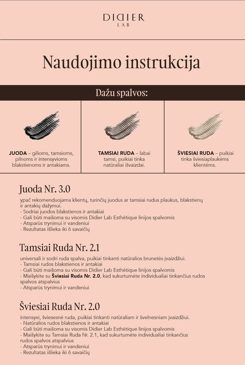 Prieš pradedant procedūrą, rekomenduojame iš anksto pasižymėti linijas, kur bus tepami dažai ant antakių (tai ypač naudinga naudojant tamsius dažus). Dažų laikymo trukmė priklauso nuo norimo atspalvio. Jei prieš dažymą buvo naudojami Didier Lab Esthétique antakių laminavimo produktai, dažymo laikas sutrumpėja iki 2-3 minučių.