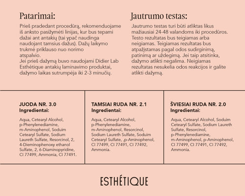 Prieš pat dažymą sumaišykite 2 cm dažų ir 15-20 lašų Didier Lab Esthétique linijos oksidacinio kremo į vientisą masę. Antakius ir blakstienas dažykite naudodami Didier Lab Esthétique dažymo šepetėlį.