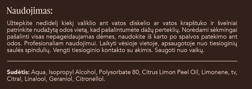 Aqua, Isopropyl Alcohol, Polysorbate 80, Citrus Limon Peel Oil, Limonene, Litsea Cubeba Fruit Oil, Citral, Linalool, Geraniol, Citronellol.