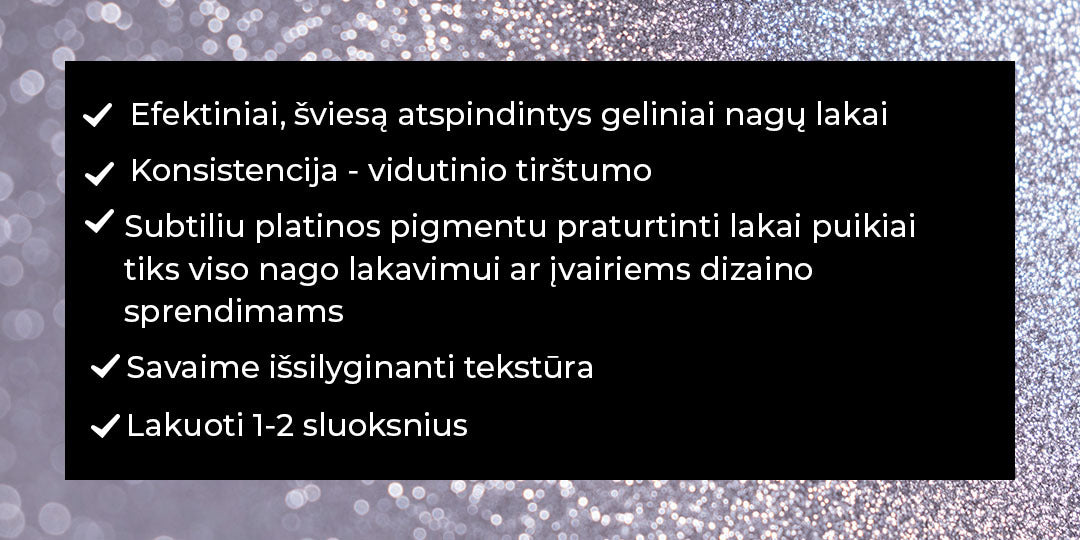 - Subtiliu platinos pigmentu praturtinti lakai puikiai tiks viso nago lakavimui ar įvairiems dizaino sprendimams.