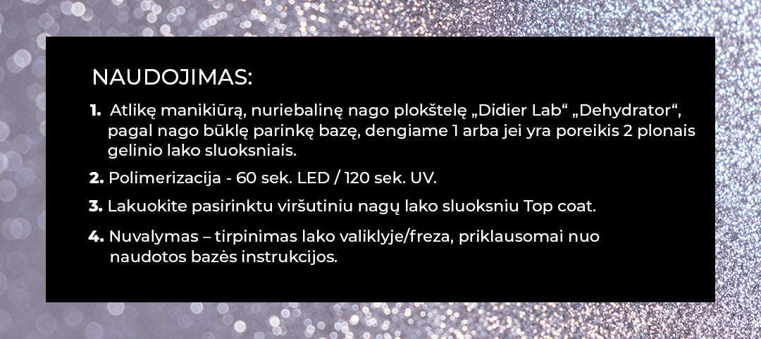 - Atlikę manikiūrą, nuriebalinę nago plokštelę "Didier Lab" "Dehydrator", pagal nago būklę parinkę bazę, dengiame 1 arba jei yra poreikis 2 plonais gelinio lako sluoksniais.