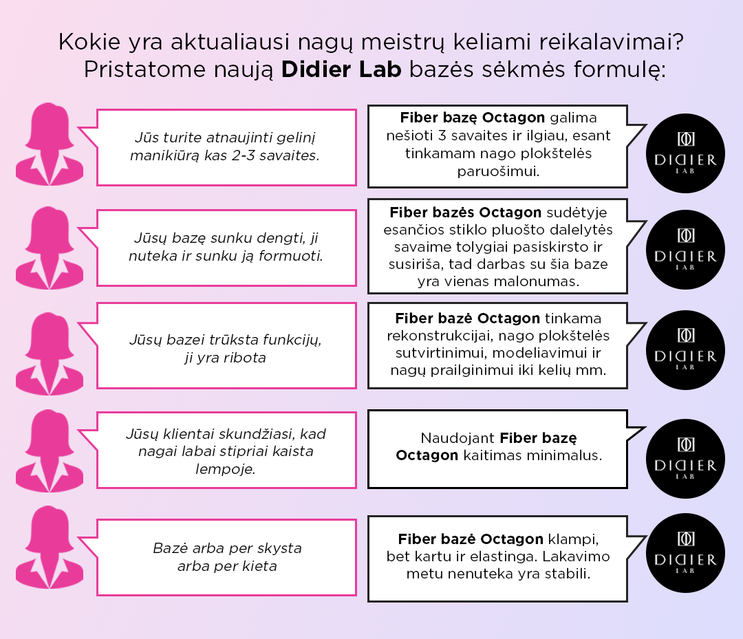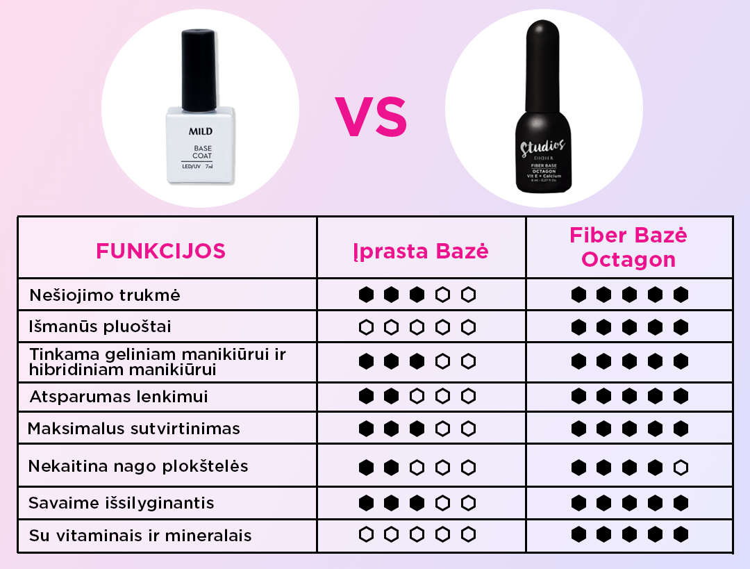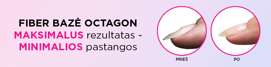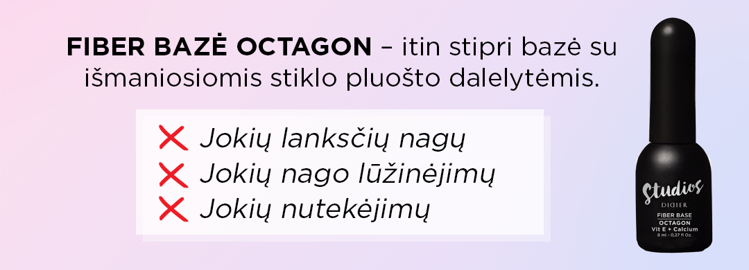 Studios Didier Fiber Octagon bazinio sluoksnio formulė yra praturtinta vitaminu E ir Kalciu. Būtent dėl šių vitaminų stokos, mūsų nagų plokštelės tampa silpnos ir nualintos. Nagai lūžinėja ir sluoksniuojasi, o padengus juos geliniu laku – neišpildomi lūkesčiai.