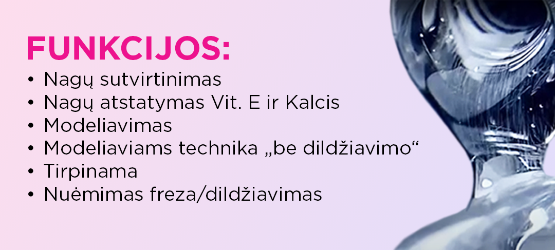 Sudėtyje esančios nailono dalelės sudaro tvirtas ir elastingas tarpusavio jungtis. Būtent jos atlieka pagrindinę nago sutvirtinimo funkciją. Manikiūras laikys ilgiau, nes polimerizacijos metu susijungusios nailono dalelytės sudarys itin stabilų ir tvirtą gelinio lakavimo pagrindą.