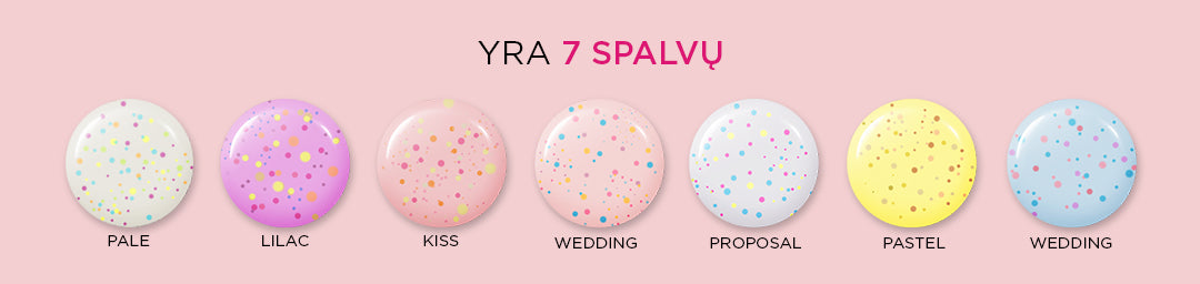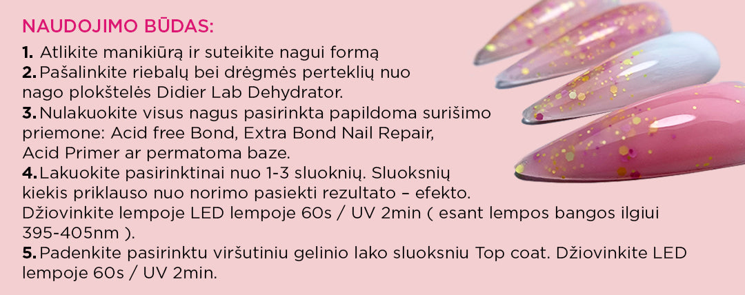 Dėmesio: Šios spalvos yra skaidrios. Kai kuriose manikiūro nuotraukose galite matyti skirtingų produktų derinį, todėl galutinis rezultatas gali atrodyti kitaip. Spalvas rekomenduojame rinktis pagal spalvų paletės nuotrauką.