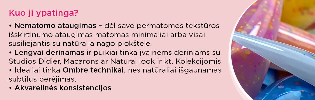 - Lakas su kamufliažinio gelio efektu (nagas nulakuotas bet, kartu, atrodo itin natūraliai). Nematomo ataugimo efektas: dėl savo permatomos tekstūros ataugimas matomas minimaliai arba visai susiliejantis su natūralia nago plokštele.