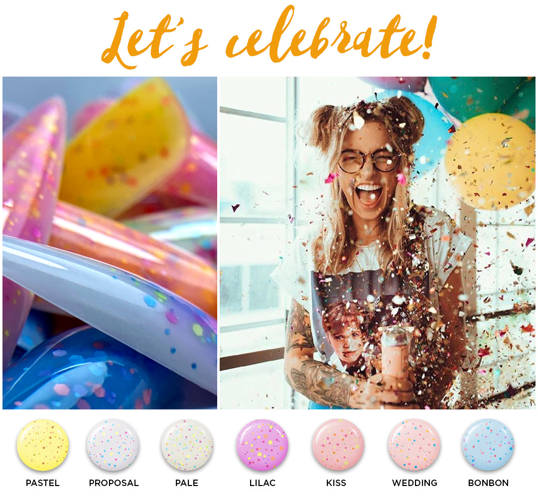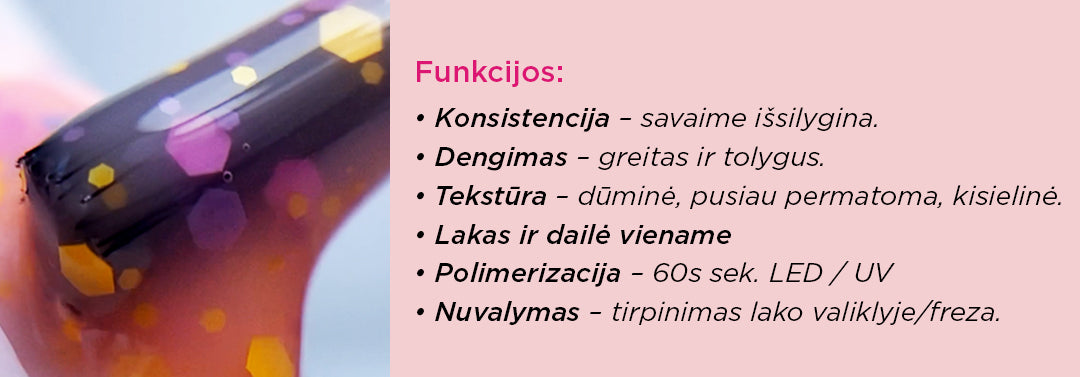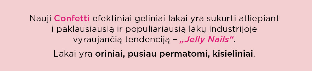 - Puikus derinys orinių lakų su įvairaus dydžio konfeti dalelytėmis. Vienu metu išpildo dvi funkcijas - lakavimo ir dizaino.