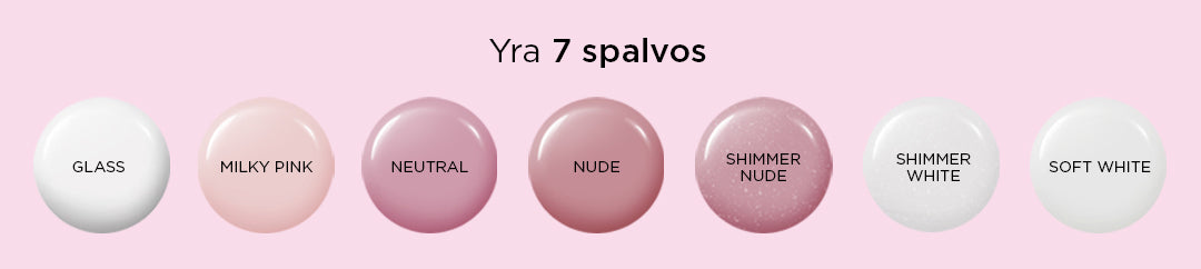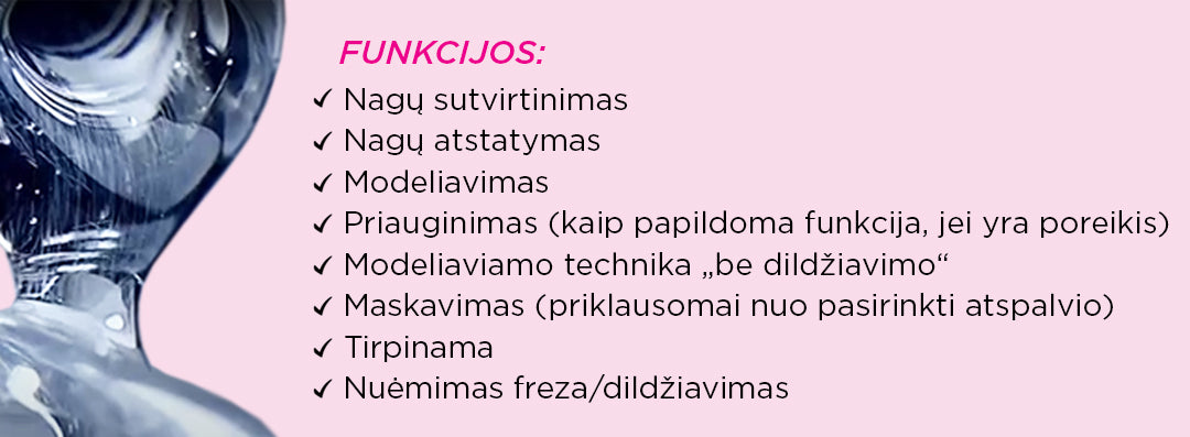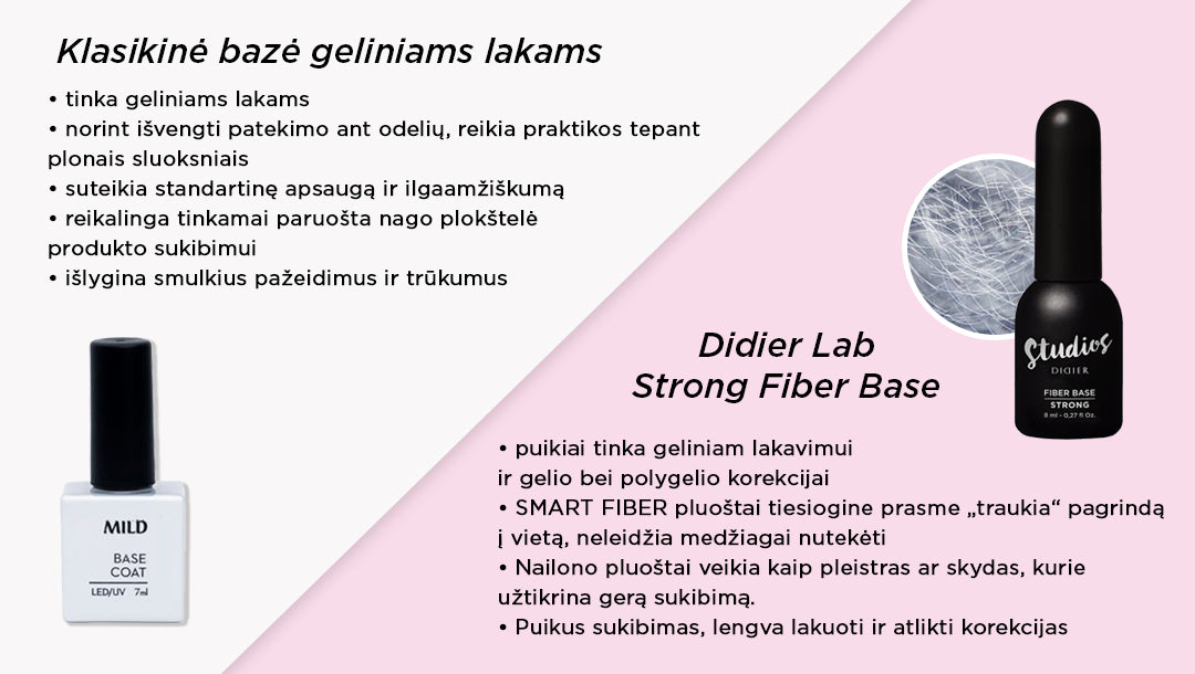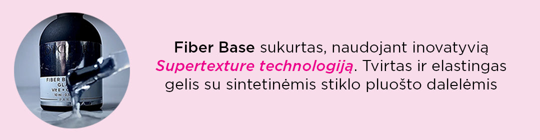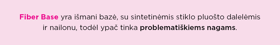 - Tvirtas ir elastingas gelis su sintetinėmis stiklo pluošto dalelėmis. Priemonė sukurta suteikti stiprinamąjį efektą ir pagerinti nago paviršiaus išvaizdą.