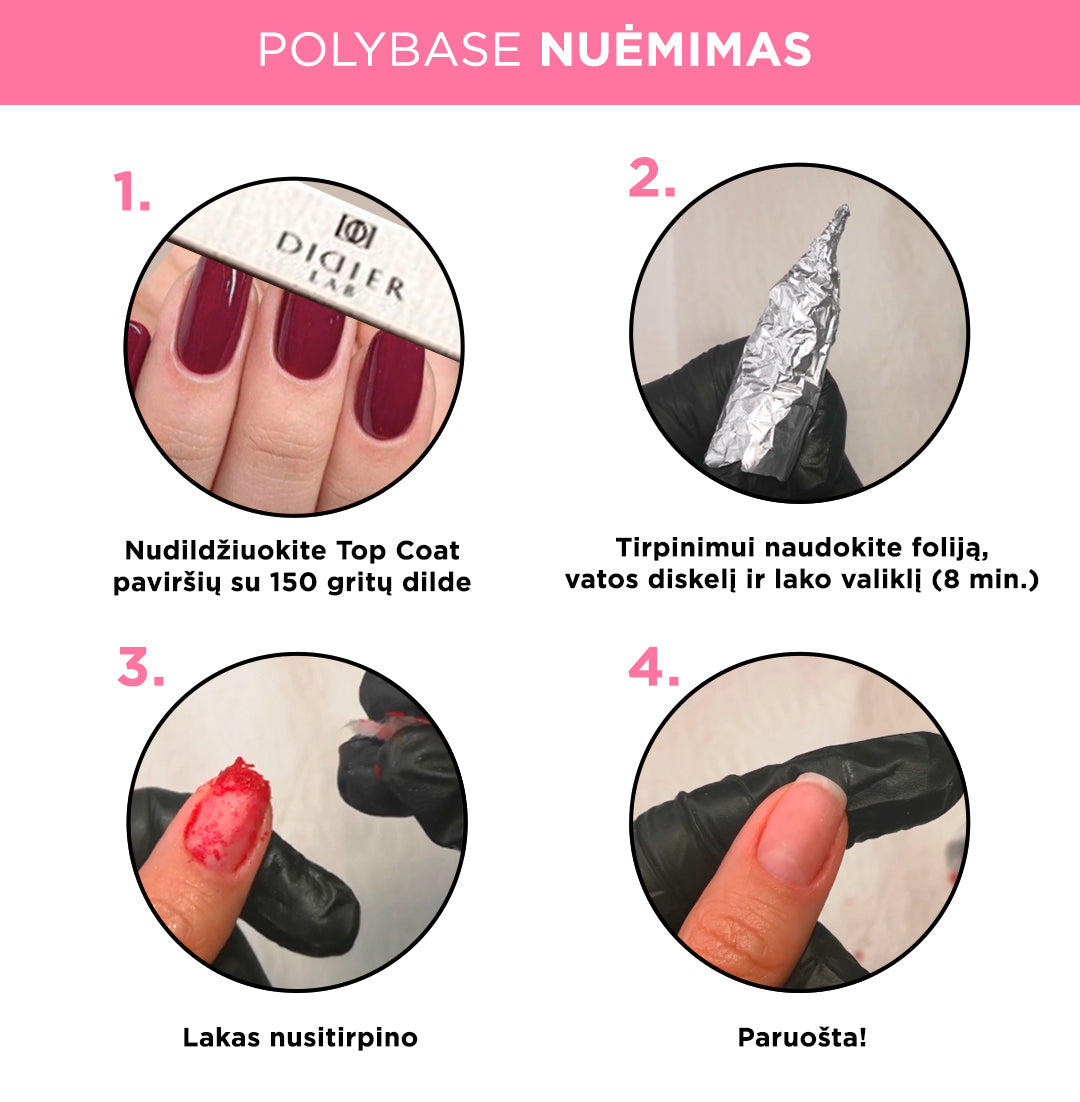 - Polybase naudojimas su gelio, akrilo ir polygelio sistemomis kaip spalvos dengimas.