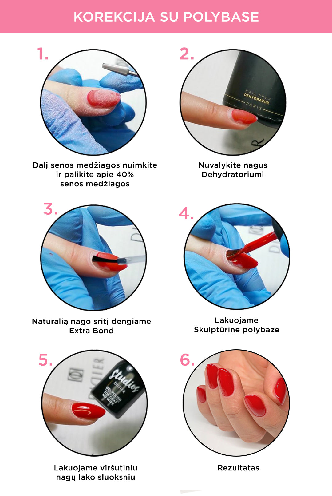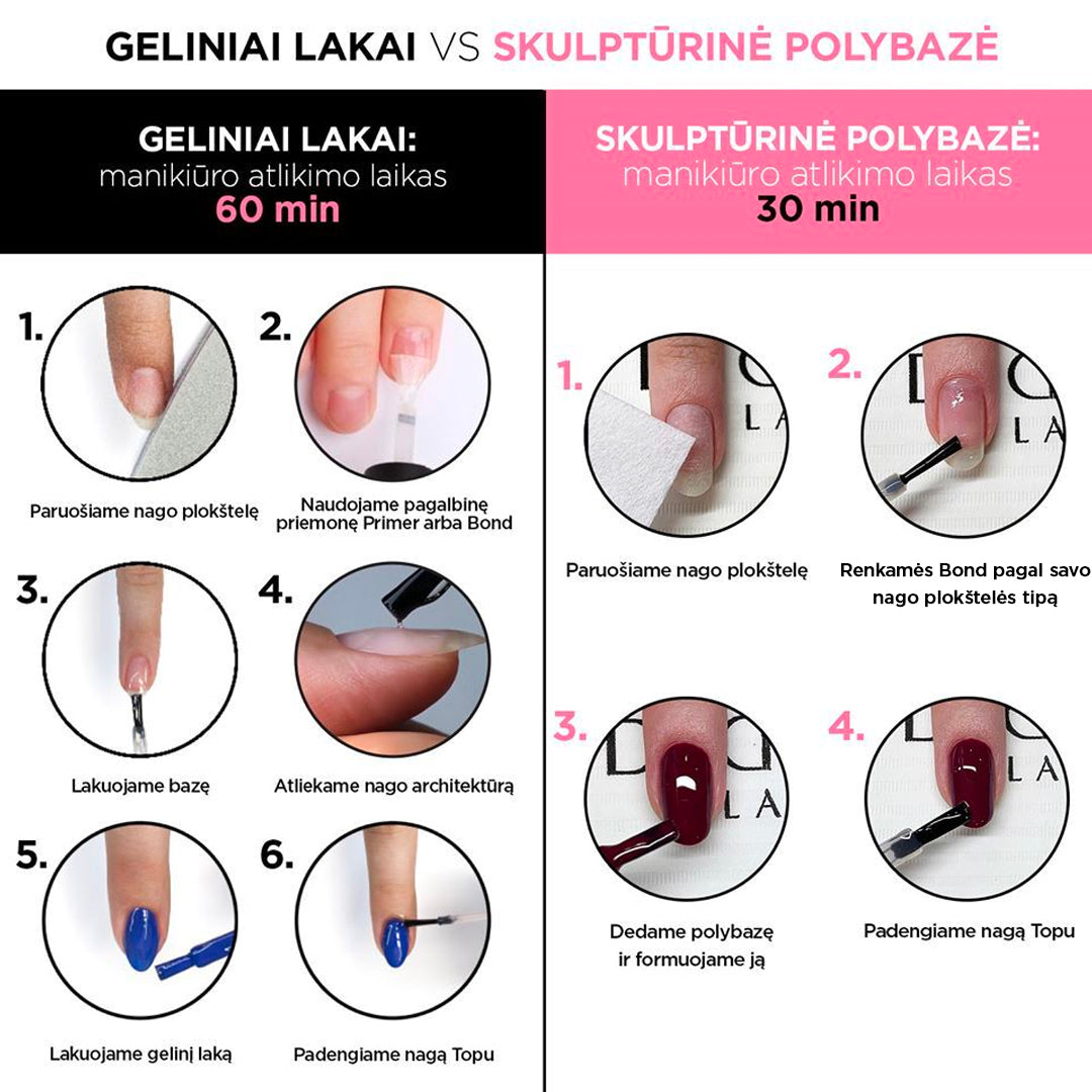 - BOND* (*Acid free Bond, Extra Bond Nail Repair, Acid Primer) + Polybase. Priklausomai nuo nago plokštelės tipo rinktis vieną iš papildomų surišėjų.
