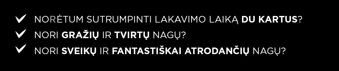 - Svarbu: Ar žinai, kad itin pigmentuotų lakų išdžiovimui lempoje įtakos turi nanometrai (spindulio ilgis)? Įsitikink, ar tavo lempa pakankamai galinga. Naujos kartos, itin pigmentuotiems lakams tinkamiausias bangos ilgis yra 395-405nm. Jei tavo lempa turi mažesnį bangos ilgį, siekiant užtikrinti tinkamą medžiagos polimerizaciją – džiovinimo laiką dvigubinkite. Rekomenduojame rinktis lempą baltu arba veidrodiniu dugnu. Šie atspindžiai pagerina polimerizacijos kokybę. Jei tokios lempos neturi, tiesiog padėk po lempos apačia baltą lapą, veidrodį arba aliuminio folijos gabalėlį.