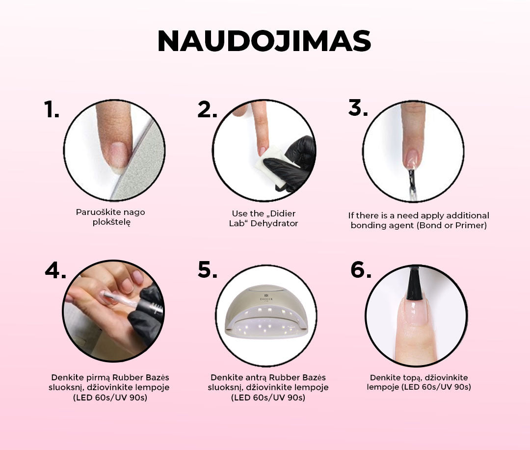 - Kiekvieną sluoksnį džiovinkite atitinkamai 90 s UV ir 60 s LED lempoje. Jei dengsite bazę storesniu sluoksniu – lempoje laikykite dvigubai ilgiau.