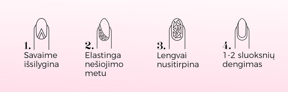- Denkite vieną sluoksnį, norėdami išgauti lengvą, permatomą efektą, du sluoksnius didesniam dengiamumui, arba storesnį antrą sluoksnį – pilnam nago plokštelės padengimui.