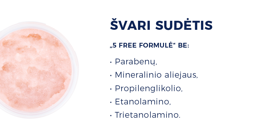 JOKIŲ: parabenų, mineralinio aliejaus, propilenglikolio, etanolamino, trietanolamino.
