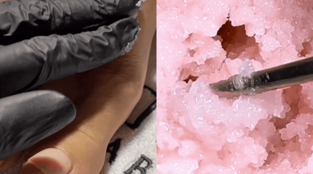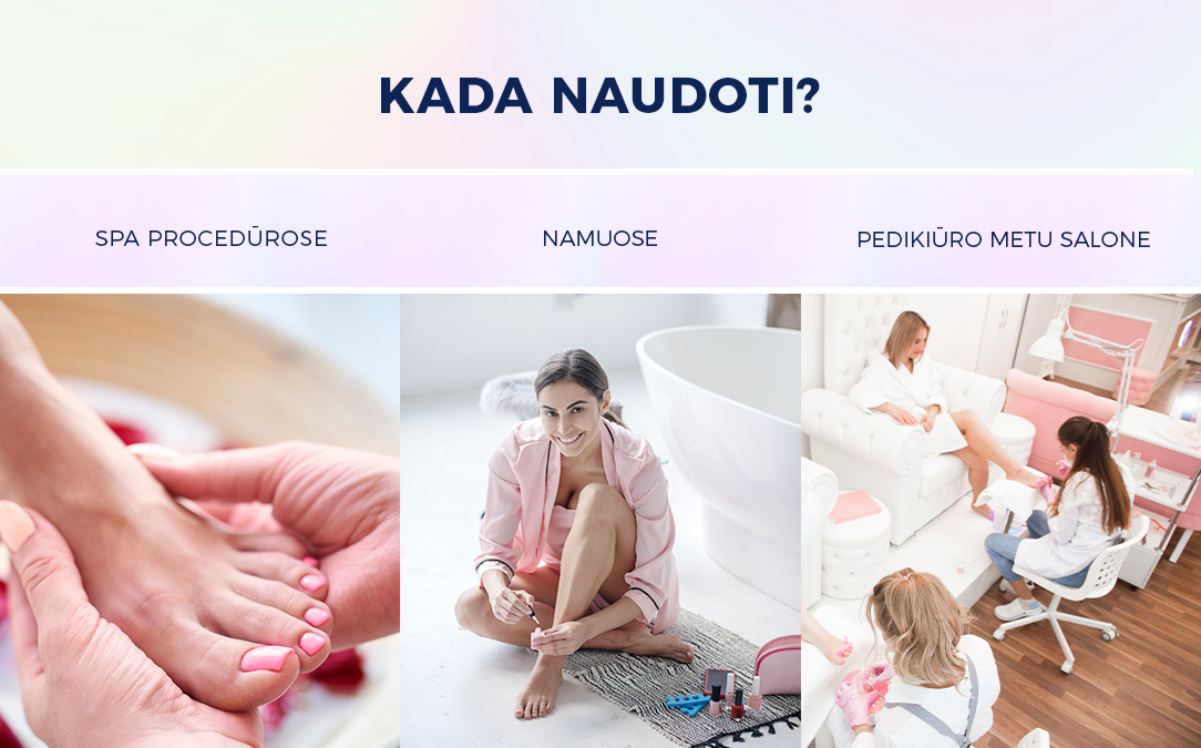 - Pedikiūro metu salone. Po atlikto gelinio ar paprasto lakavimo masažuojamaisiais judesiais nupilinguokite pėdas. Nuplaukite šiltu vandeniu, nusausinkite popierine servetėle. Nebenaudokite jokio kremo.